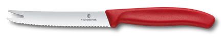 This knife features a professional sharp stainless steel blade with a wavy edge and forked tip for easy slicing and serving. Its ergonomically shaped handle ensures a comfortable grip. Swiss made and dishwasher safe, it offers lasting quality and easy maintenance.